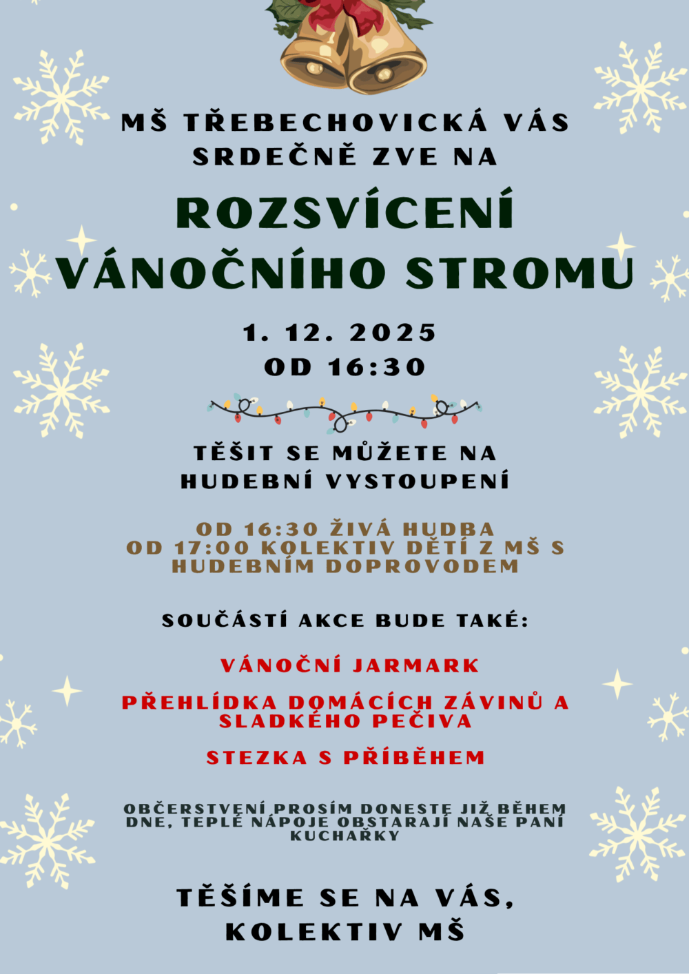 rádi bychom vás srdečně pozvali na naši každoroční akci Rozsvícení vánočního stromu, která se bude konat v pondělí 1. 12. 2025 od 16:30.