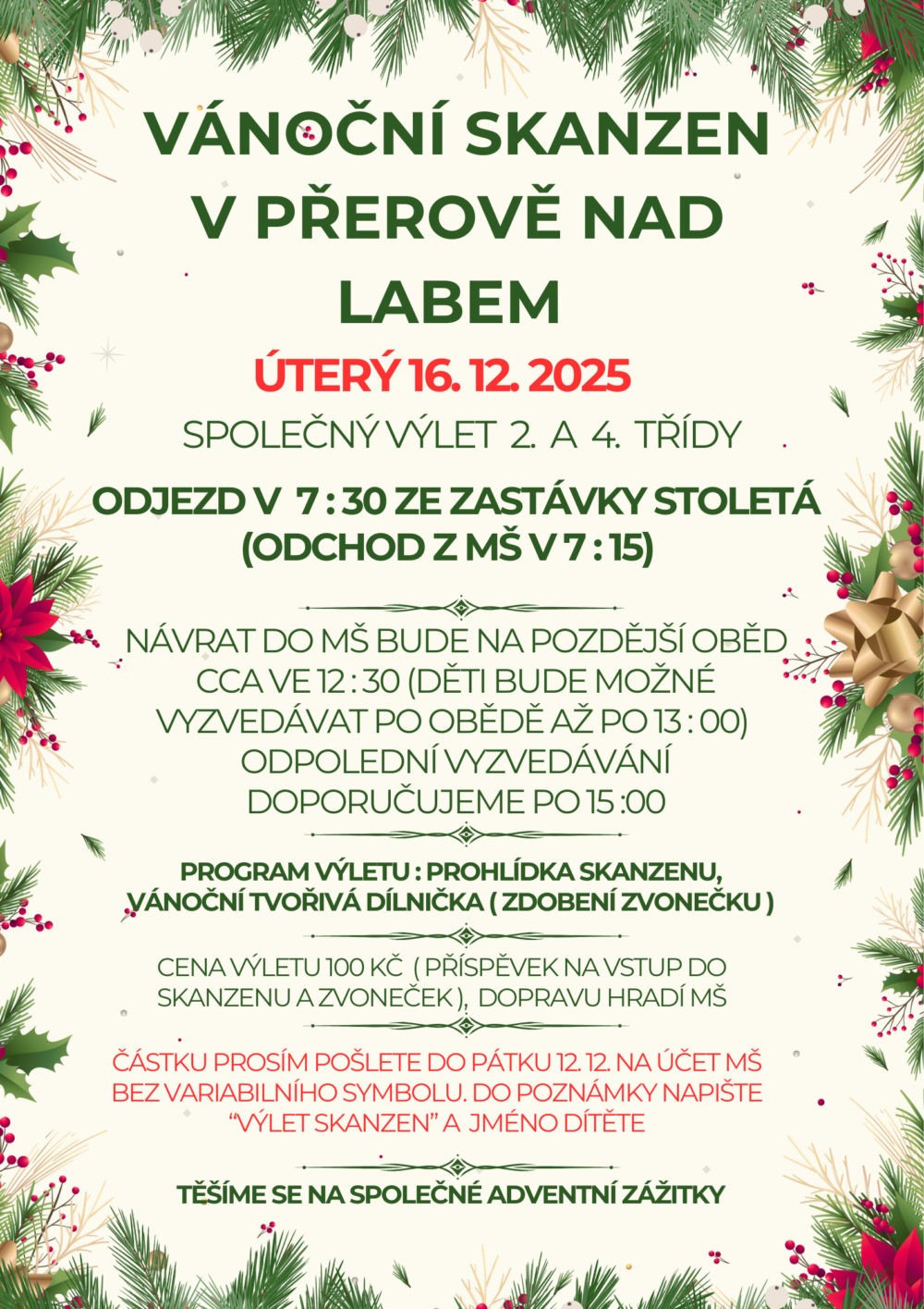 v úterý 16. 12. pojedeme s dětmi na výlet do vánočního skanzenu v Přerově nad Labem. Veškeré informace k odjezdu i k platbě najdete na přiloženém plakátu.